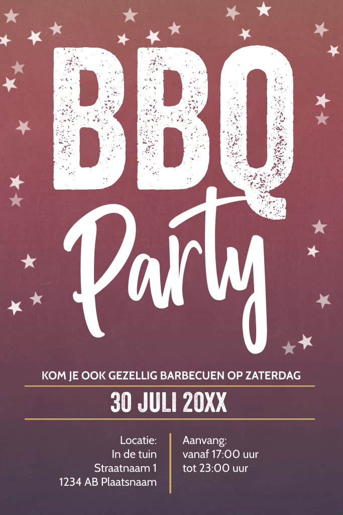 Leuke typografische uitnodiging voor een BBQ Party met feestelijke kleine sterretjes. Grote witte teksten en mooie paarse en rode kleuren die je zelf kan personaliseren.