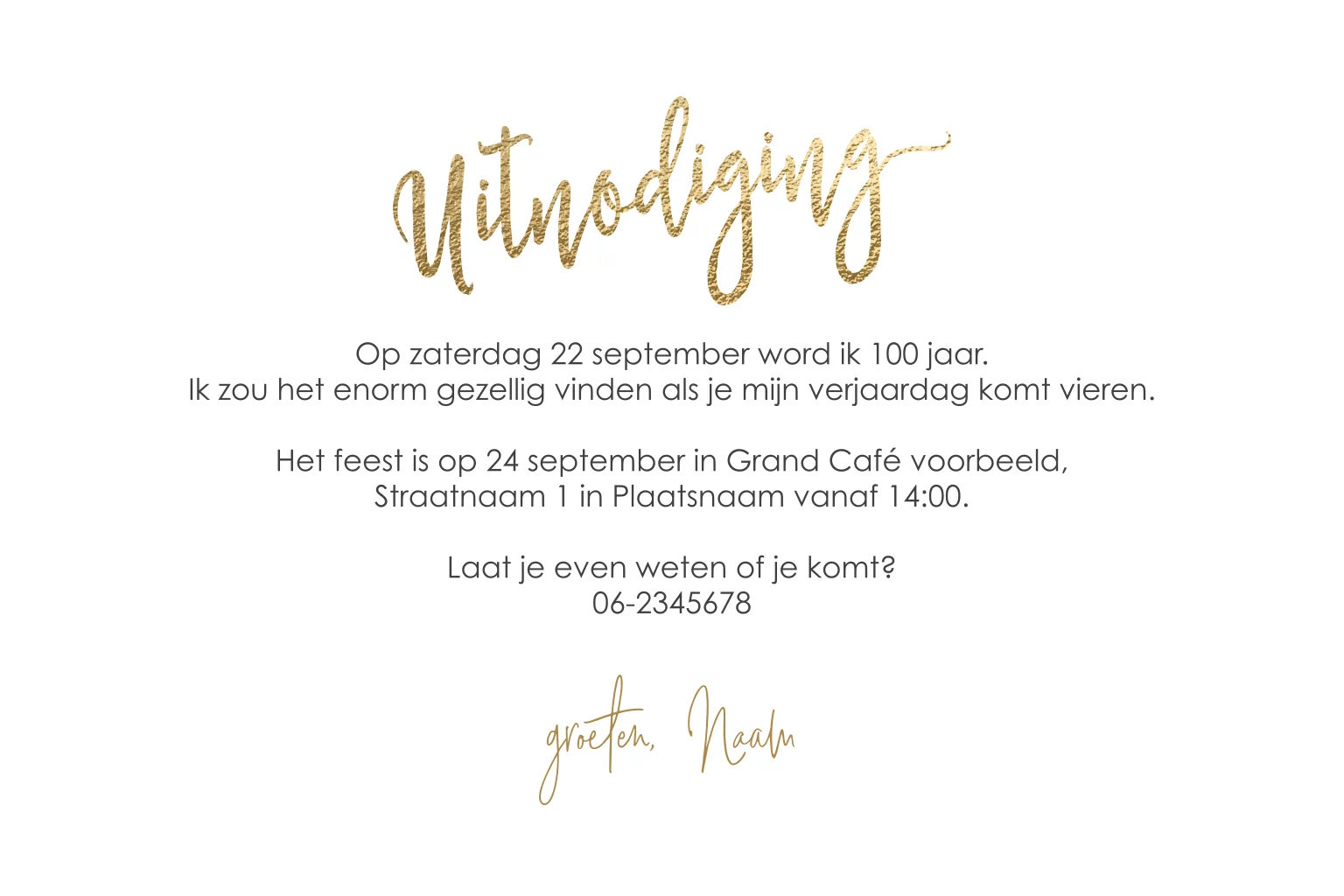 Chique uitnodigingen met eigen foto voor 100 jaar met mooie goud effect achtergronden en mooie stijlvolle typografie van Luckz.