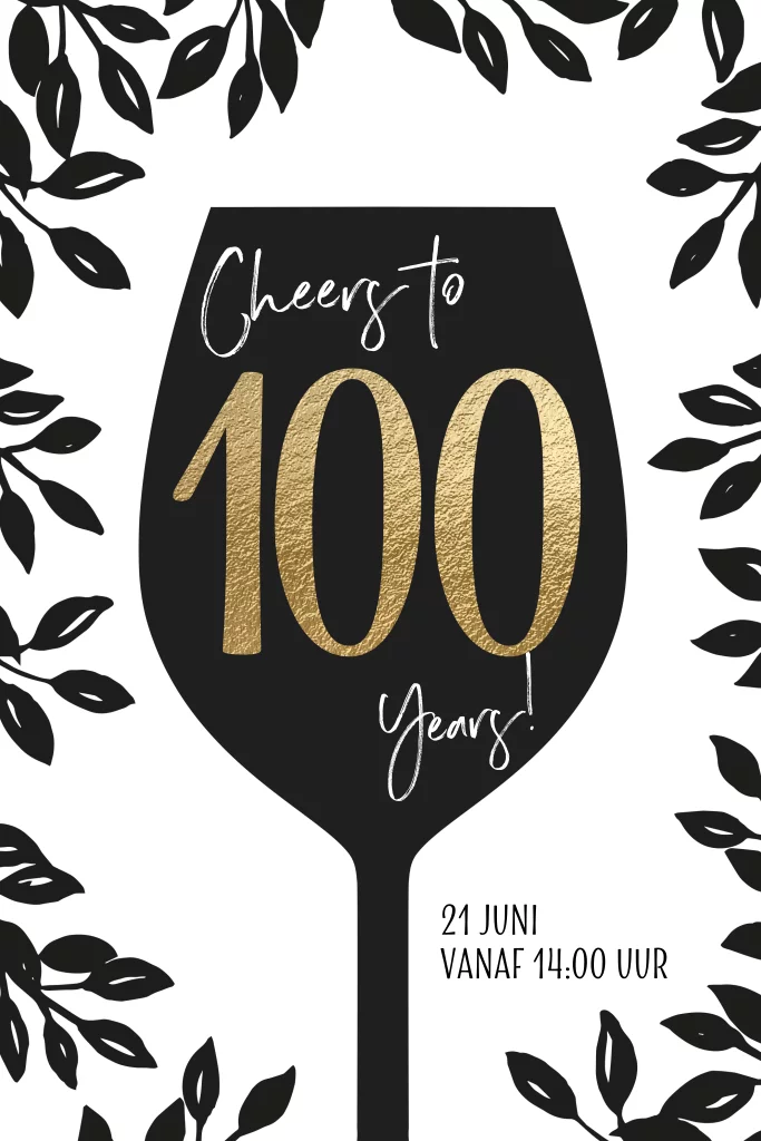 Stuur iedereen deze stijlvolle uitnodiging met zwart, wit en gouden illustraties, typografische teksten "Cheers to 100 years!" en mooie botanische bladeren.