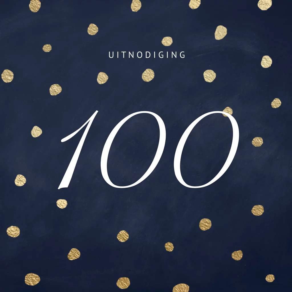 Chique uitziende uitnodigingen voor een honderdste verjaardag met mooie gouden stippen op een donker blauwe achtergrond en groot de leeftijd 100 jaar in witte typografie op de voorkant. In de binnenkant komen de gouden stippen terug en kun je alle uitnodigingstekst schrijven.