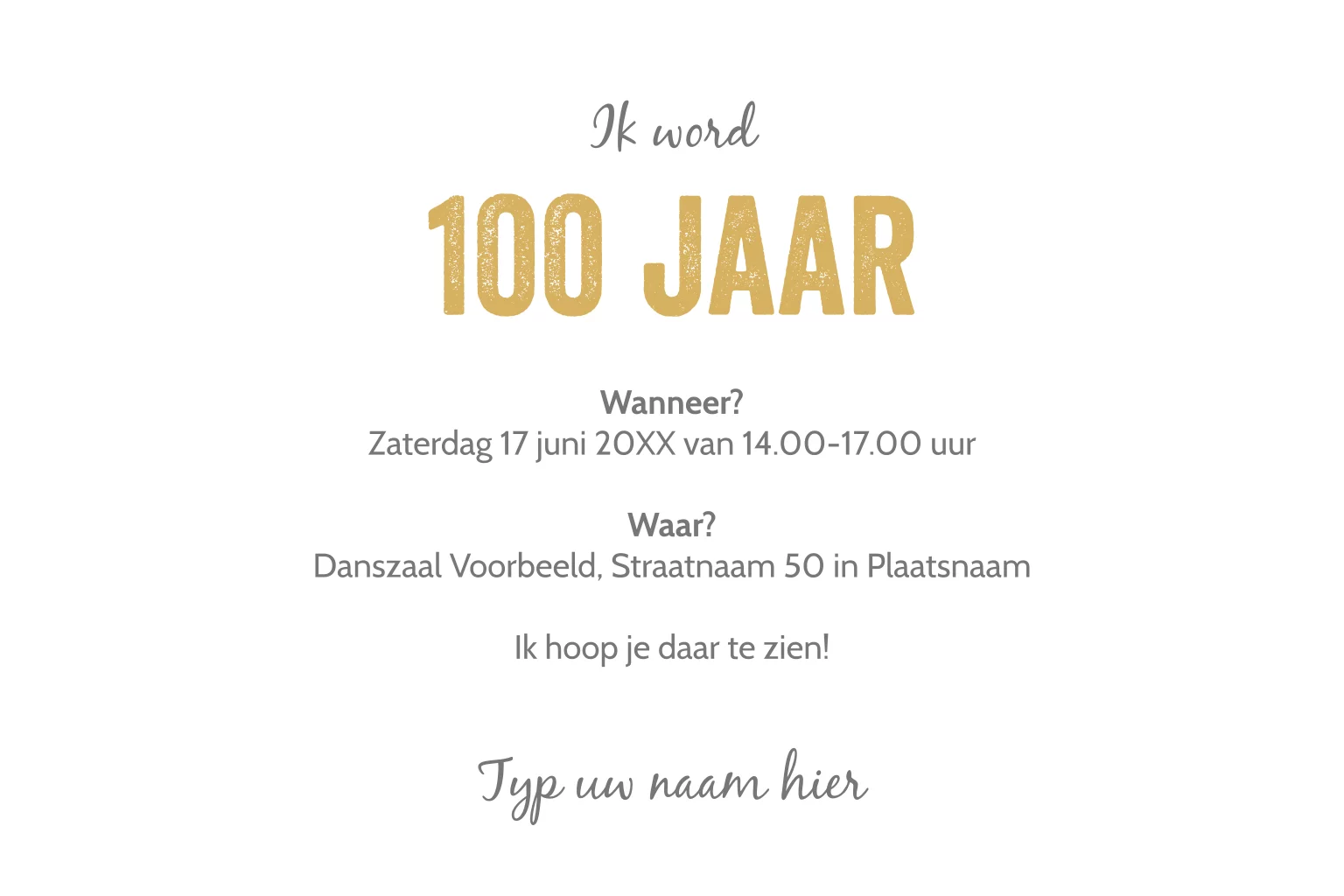 Een 100e verjaardag is een mijlpaal in het leven van elke persoon. Het is een moment om te vieren en herinneringen op te halen. Een mooie manier om dit te doen, is door middel van een gepersonaliseerde uitnodiging met foto's van de jarige van toen en nu op de voorkant. Alles op deze mooi uitnodigingen is te personaliseren in onze handige editor.