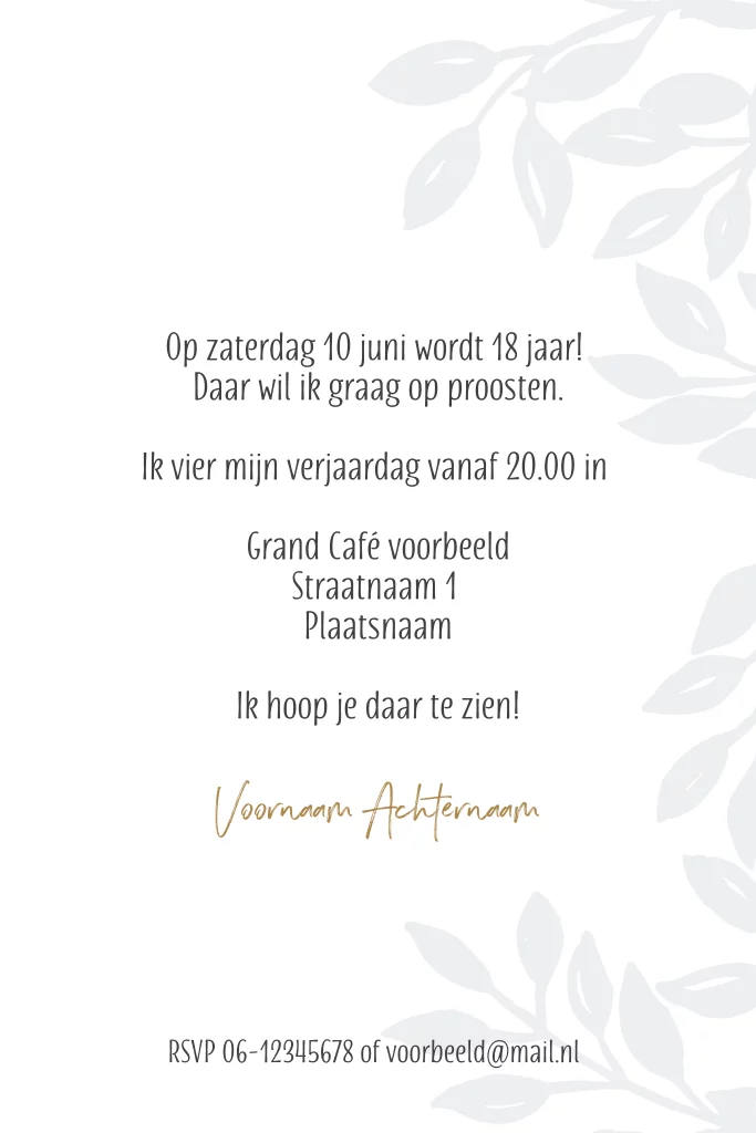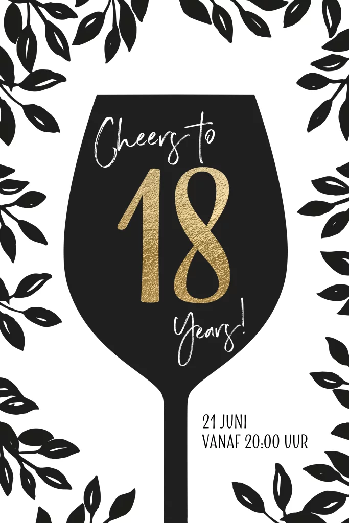 Stijlvolle verjaardag uitnodiging voor 18 jaar met een groot wijnglas met tekst "Cheers to 18 years!" met de kleuren zwart, wit en goud.