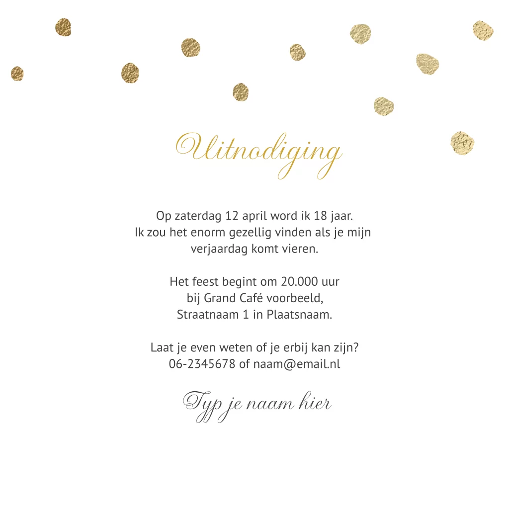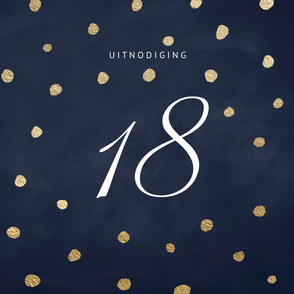 Een chique uitziende uitnodiging voor een achttiende verjaardag met hippe gouden stippen op een donker blauwe krijtbord effect achtergrond en groot de leeftijd 18 jaar (aanpasbaar) in witte typografie op de voorkant van de uitnodigingskaart. In de binnenkant komen de gouden stippen terug en kun je alle uitnodigingsinformatie schrijven.