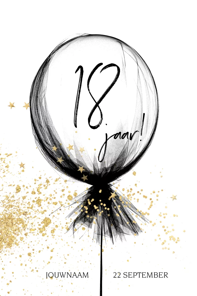 Maak zelf deze trendy verjaardag uitnodigingskaart voor 18 jaar bij Luckz. Met een trendy zwarte doorzichtige ballon en feestelijke goud spetters op een witte achtergrond. Alles op deze uitnodigingen is eenvoudig zelf te personaliseren.