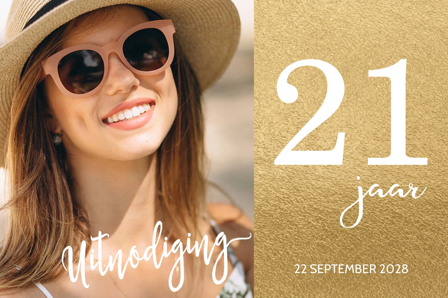 Uitnodigingen met je eigen foto op de voorkant en goud effect achtergrond met daarop in leuke typografische tekst 21 jaar (leeftijd aan te passen).