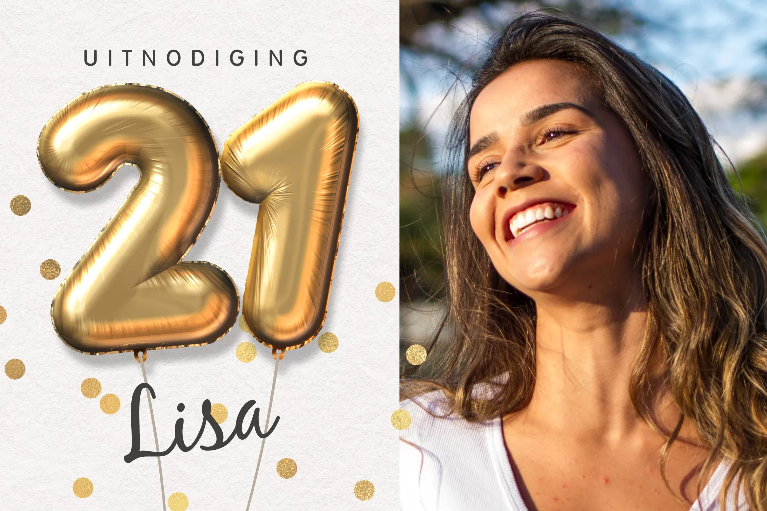 Maak zelf deze feestelijke uitnodiging voor een verjaardag van 21 jaar met grote gouden cijfer ballonnen en jouw eigen foto op de voorkant.