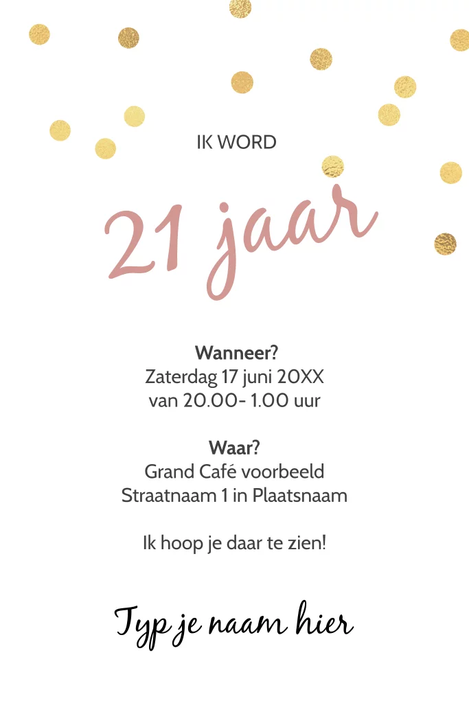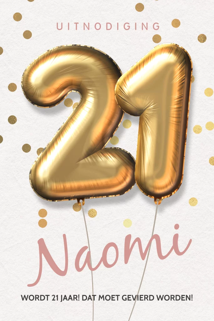Ontwerp zelf deze feestelijke verjaardag uitnodiging voor 21 jaar, met grote hippe gouden ballonnen met confetti op een mooi lichte achtergrond.
