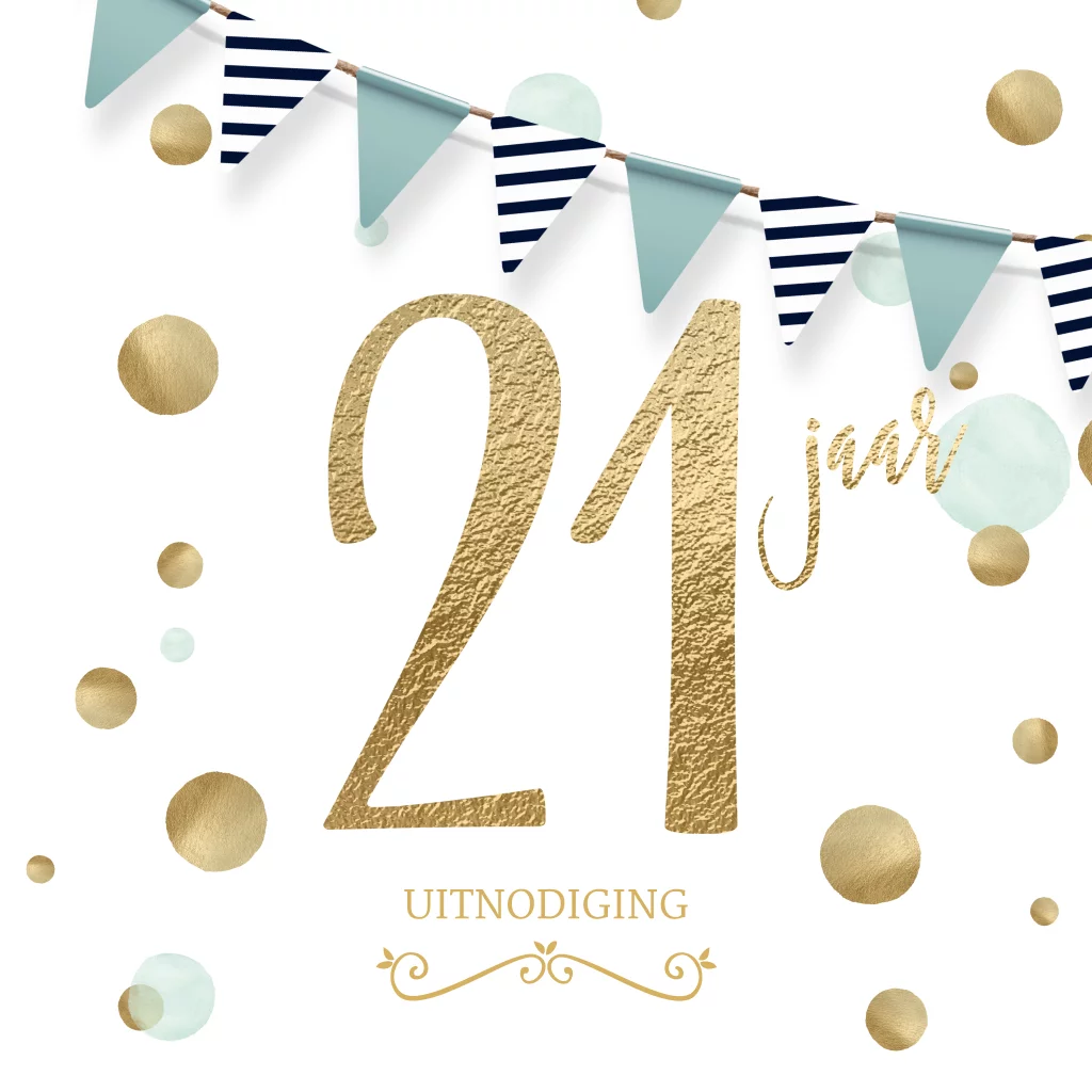 Maak zelf deze mooie uitnodiging verjaardag 21 jaar voor je feest of 21 diner. Met stijlvolle goud look 21 cijfers op een witte achtergrond met feestelijke bubbels en vlaggetjes. Maak deze uitnodiging zelf bij Luckz.