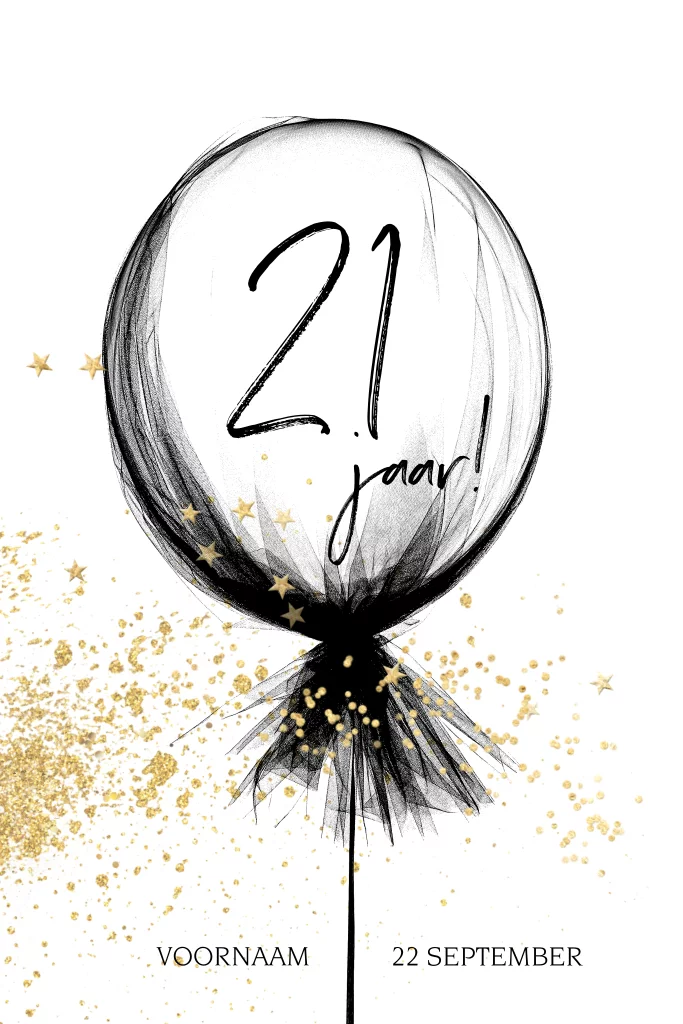 Met een hippe zwarte illustratie van een ballon en feestelijke goud spettertjes en sterren op een witte achtergrond.