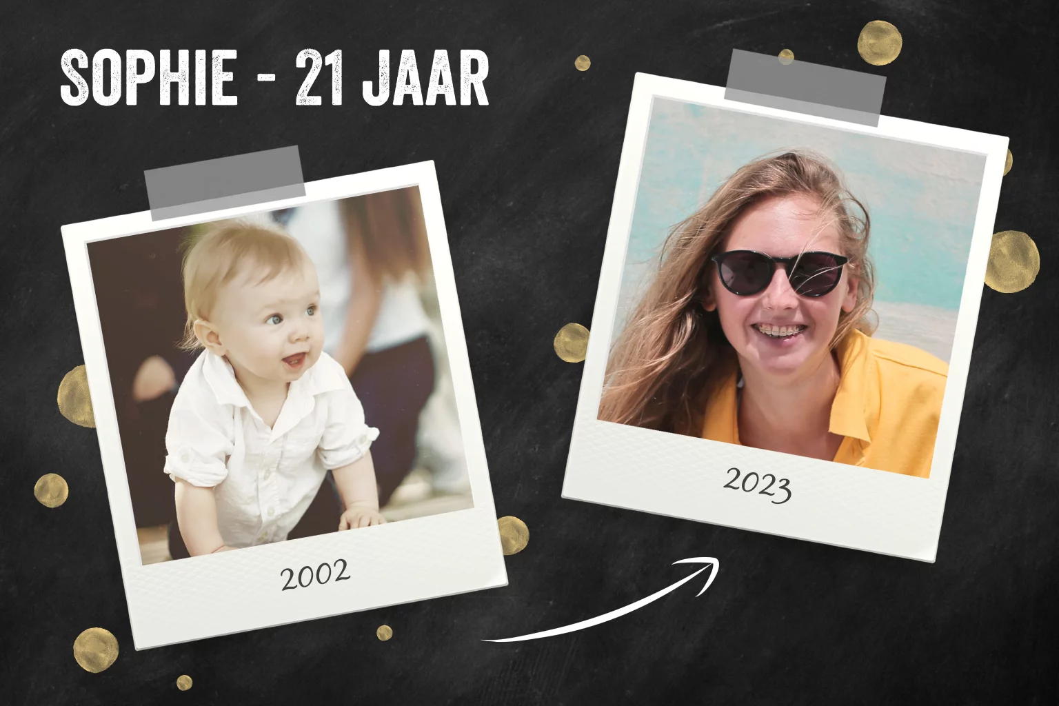 Verjaardag uitnodiging 21 jaar foto toen en nu krijtbord