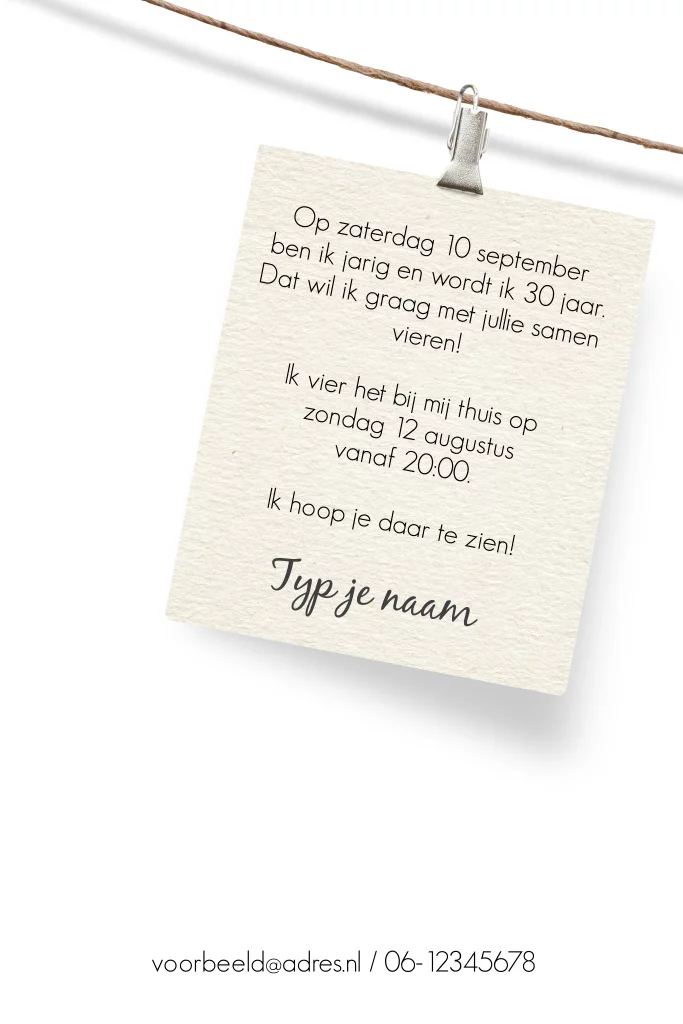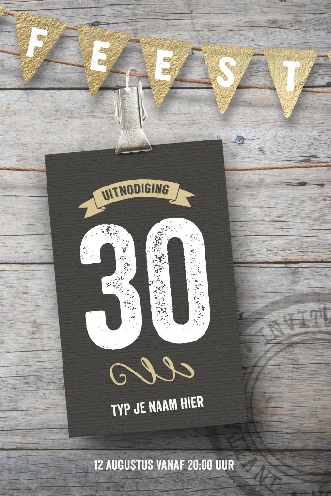 Feestelijke verjaardag uitnodiging voor 30 jaar met een leuk hangend label met daarop jouw leeftijd en mooie gouden slinger met de tekst "FEEST".