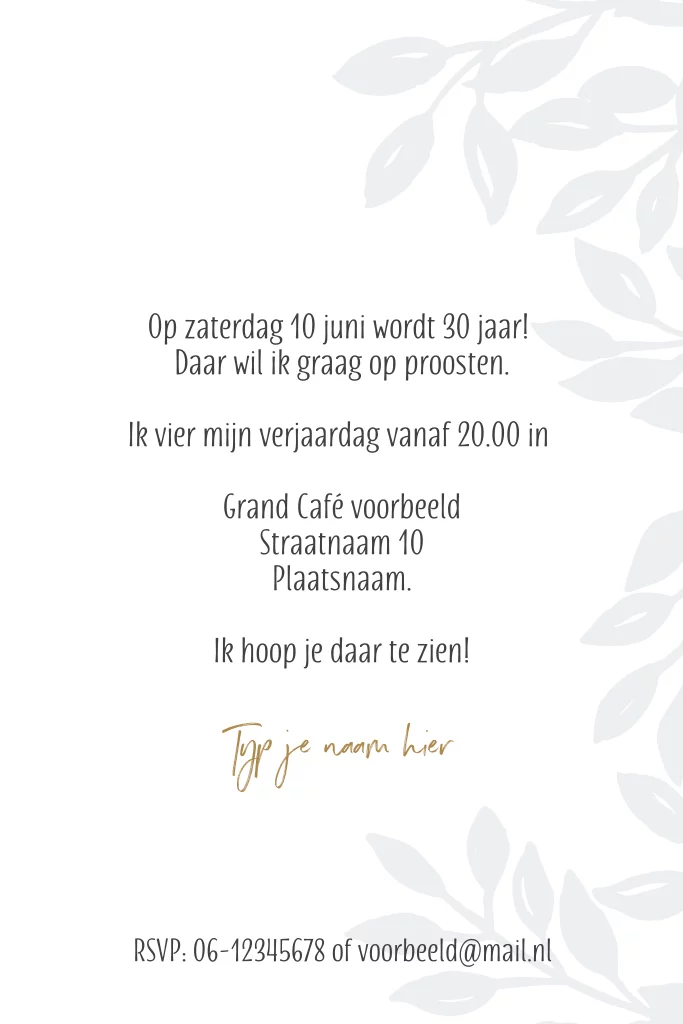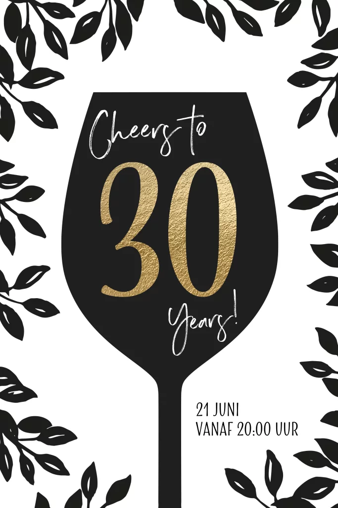 Mooie verjaardag uitnodiging 30 jaar met de tekst "Cheers to 30 years!". Op de voorkant een illustratie van een groot glas wijn met de stijlvolle kleuren zwart, wit en goud en rondom kleine zwarte botanische blaadjes.