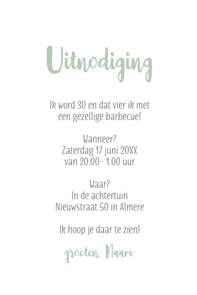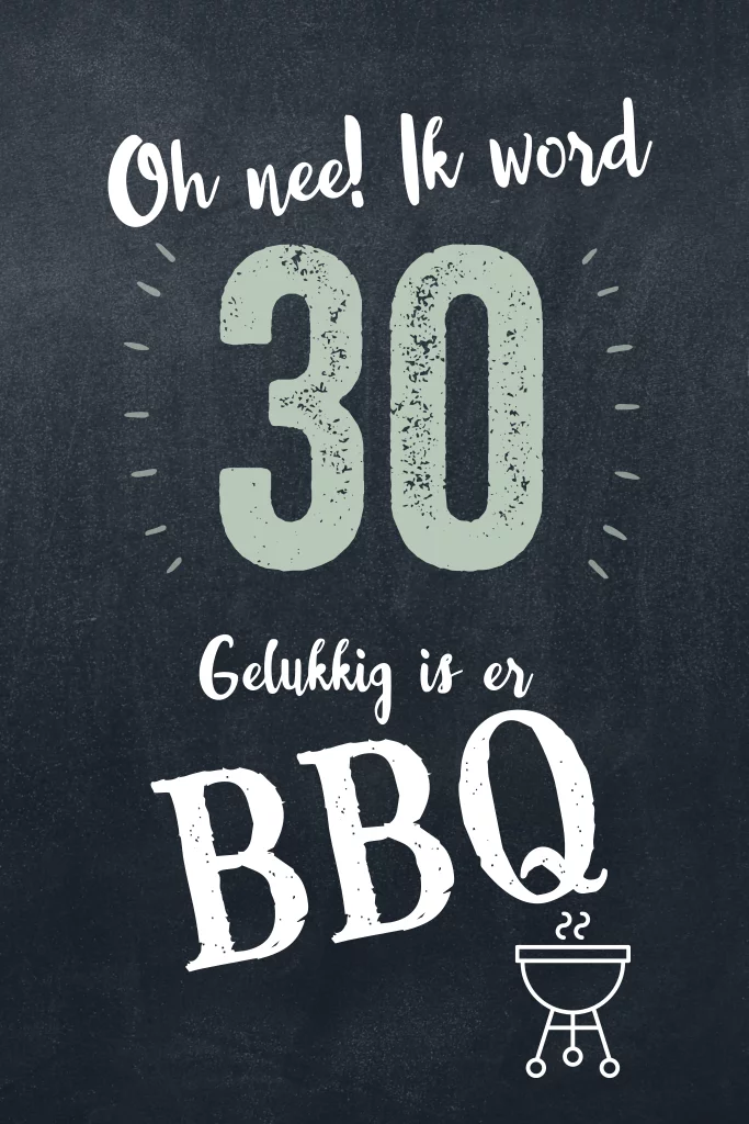 Grappige verjaardag uitnodiging met de tekst "Oh nee ik wordt 30 jaar, gelukkig is er BBQ". Verander het woord Barbeque gemakkelijk in bier, tapas, muziek of een ander woord dat goed bij je past. Alle kleuren, leeftijd en uitnodigingsteksten kun je zelf gemakkelijk personaliseren.