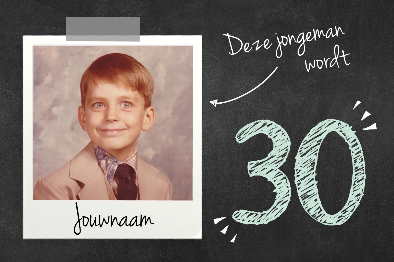 Originele uitnodiging met foto van vroeger voor een verjaardag van 30 jaar. Met je eigen foto, aanpasbaar jaartal 30 jaar, eigen uitnodigingsteksten en hippe krijtbord achtergrond. Maak je eigen originele uitnodiging voor je dertigste verjaardag.