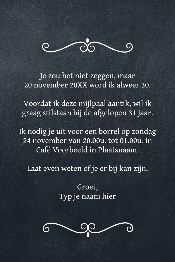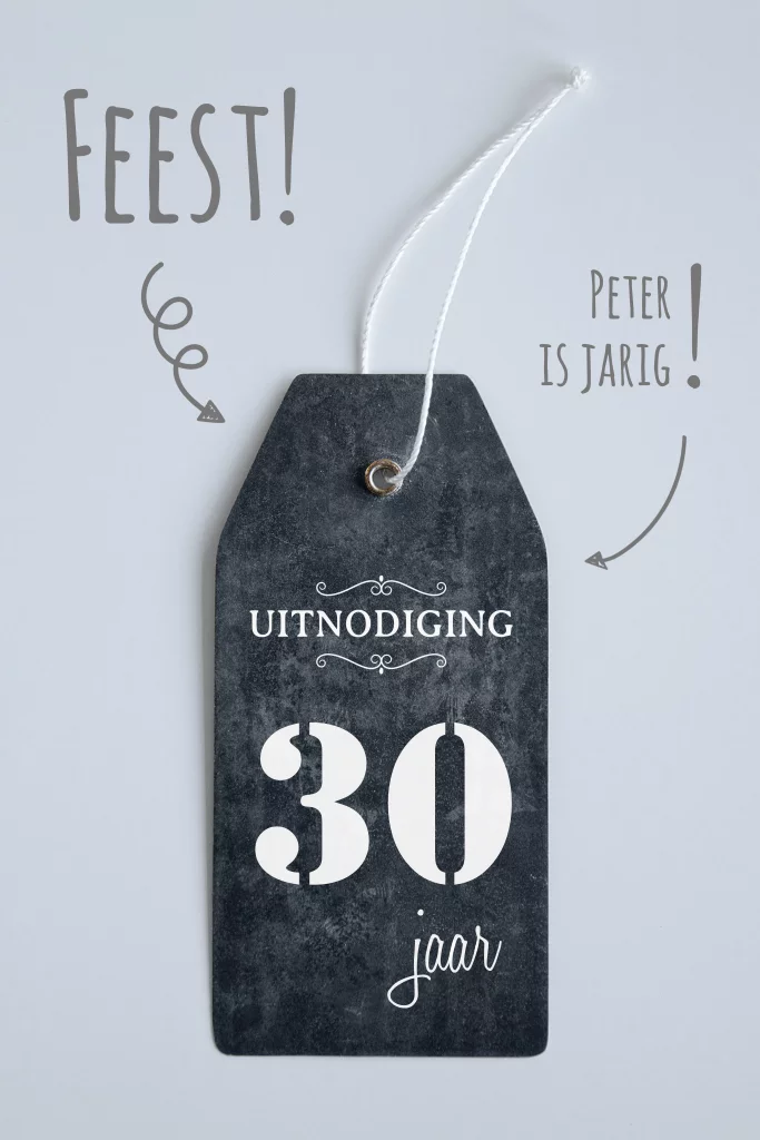 Hippe uitnodiging voor een verjaardag van 30 jaar met een leuk zwart krijtbord label met teksten op de voorkant. En een krijtbord binnenkant.