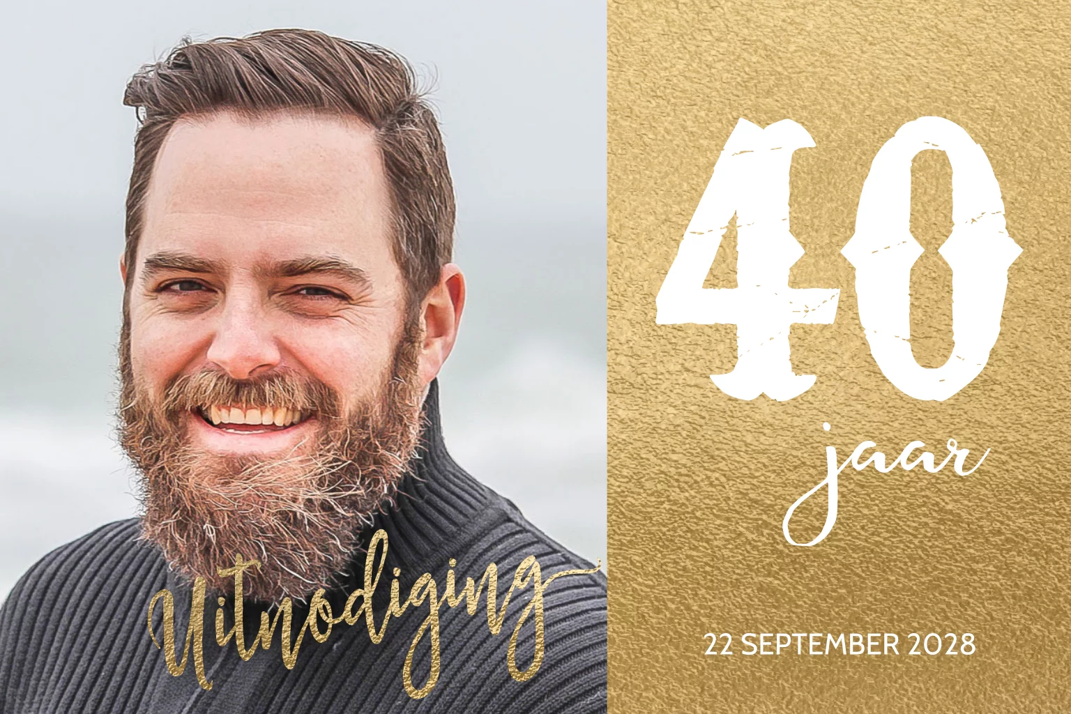 Uitnodiging met eigen foto en goud look achtergrond met daarop in mooie typografische tekst 40 jaar.