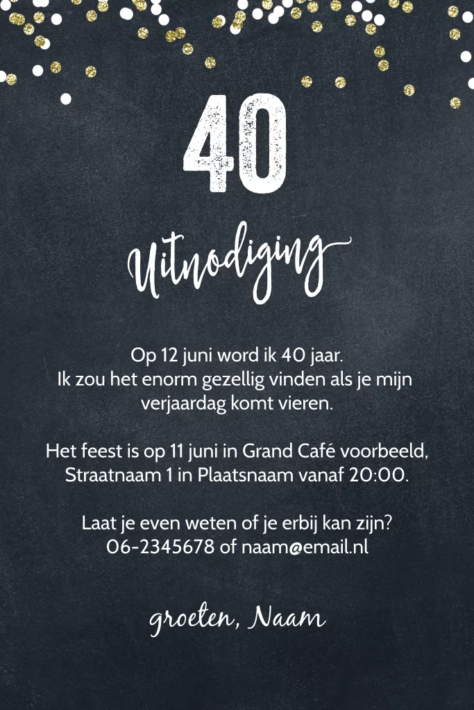 Zet je eigen foto in op de voorkant van de uitnodiging voor 40 jaar. Rondom staat feestelijke goud met witte confetti stippen. In de binnenkant kun je zelf een leuke uitnodigingstekst schrijven.
