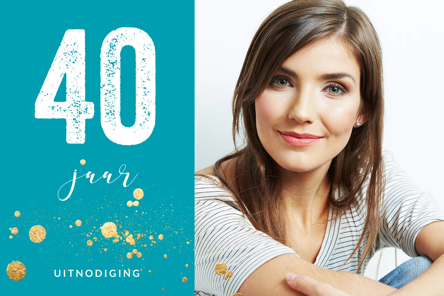 Feestelijke verjaardagsuitnodiging met eigen foto, goud spetters en aanpasbare zeegroene ondergrond kleur.
