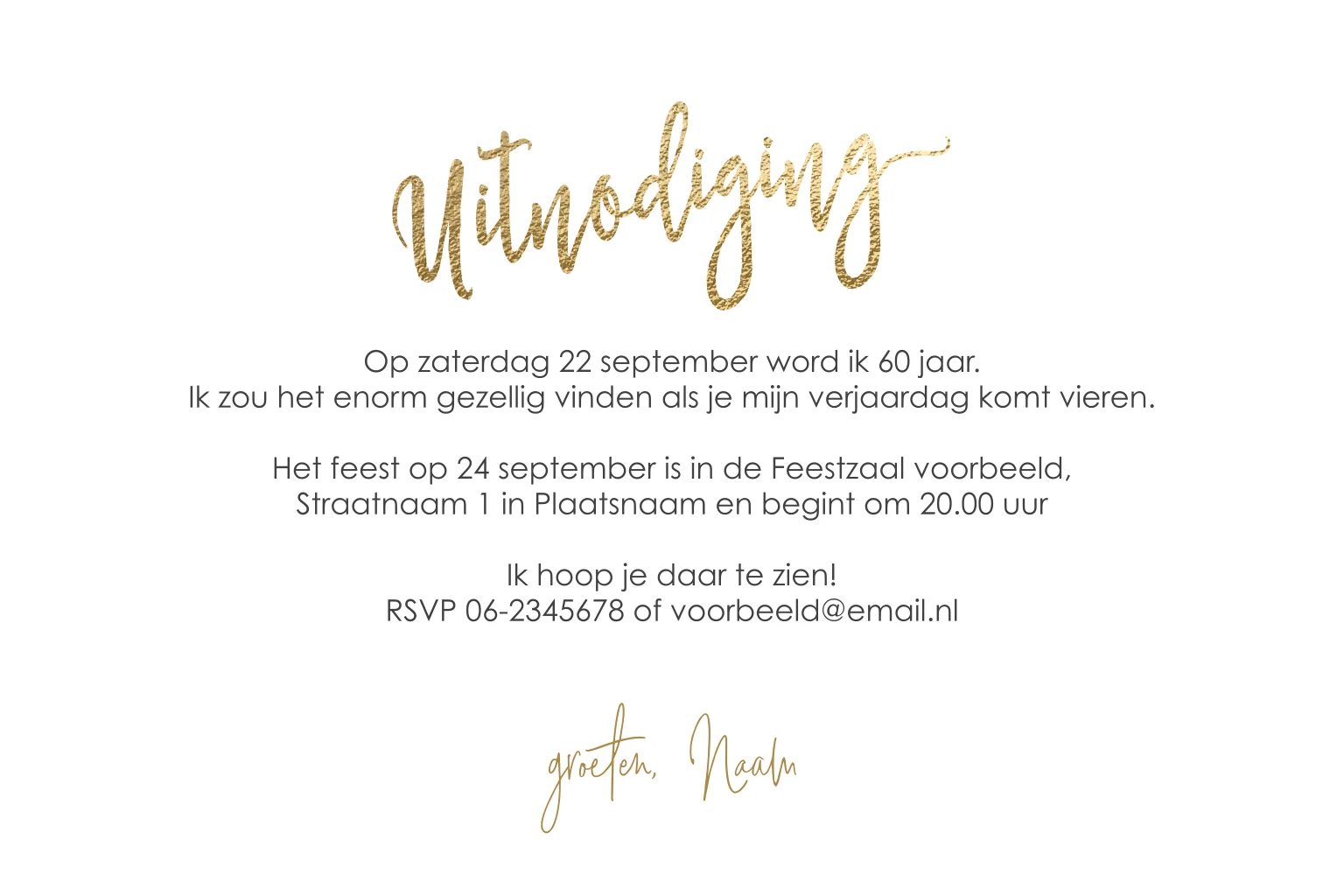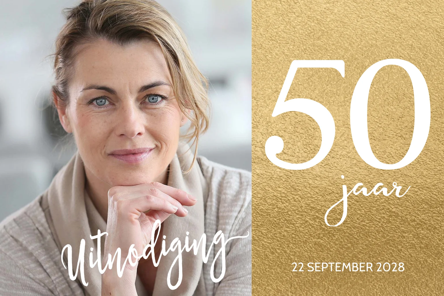 Chique uitnodiging met je eigen foto op de voorkant en goud effect achtergrond met daarop in leuke lettertypes de tekst 50 jaar (leeftijd aan te passen).