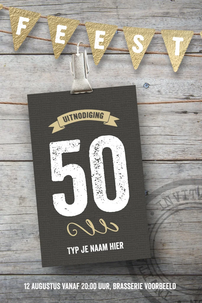 Leuke verjaardag uitnodiging voor 50 jaar met gouden slinger met de tekst "FEEST" en een label waar je jouw eigen leeftijd in kan zetten.