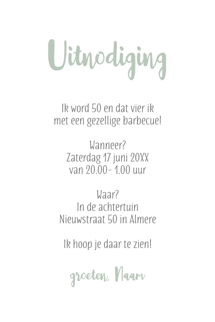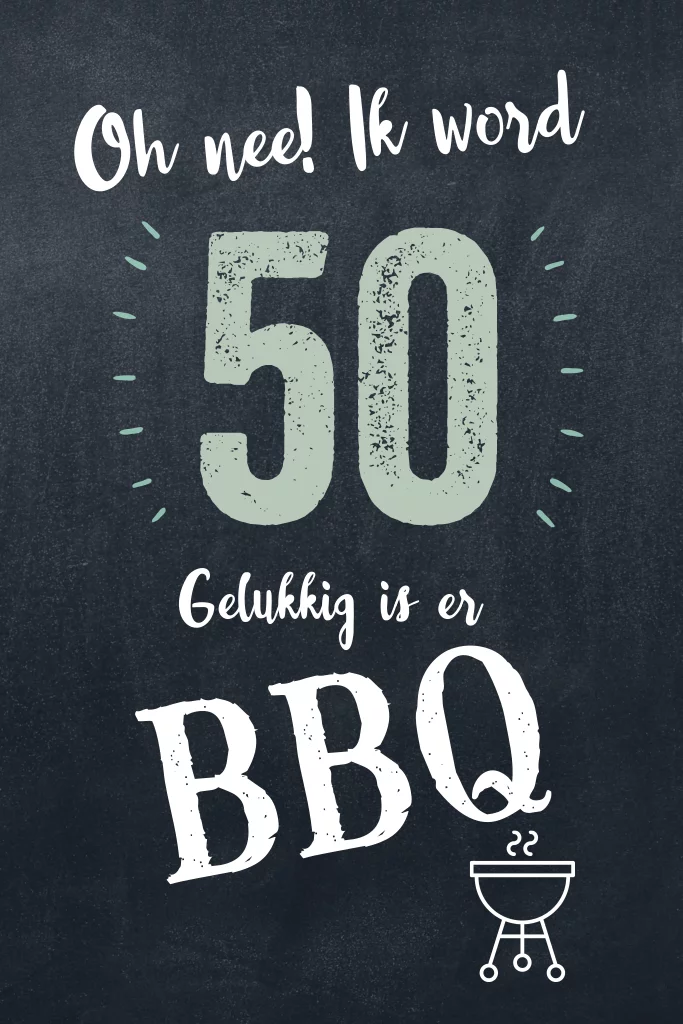 Leuke en grappige verjaardag uitnodiging met de tekst "Oh nee ik wordt 50 jaar, gelukkig is er BBQ". Alle kleuren en teksten kun je aanpassen. Zo verander je het woord barbecue gemakkelijk in bier, tapas, muziek of een ander woord dat goed bij je past. De krijtbord achtergrond, lettertypes en groene kleuren kun je allemaal personaliseren.