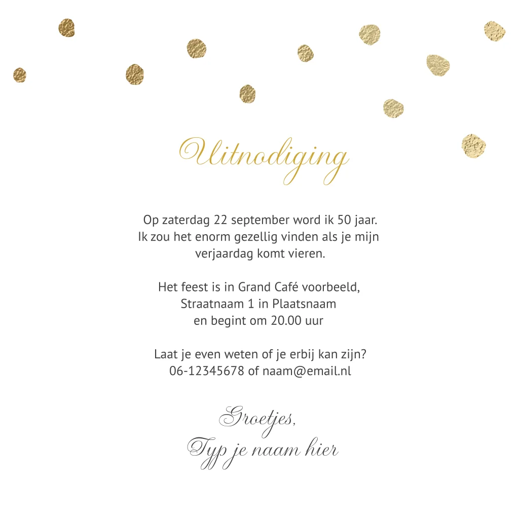 Stijlvolle uitnodiging voor een verjaardag van 50 jaar die je zelf kan aanpassen en personaliseren bij Luckz.