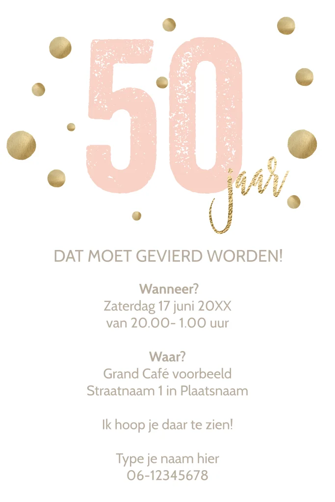 Luxe verjaardag uitnodiging voor 50 jaar met stijlvolle gouden en roze letter typografie op een witte achtergrond.