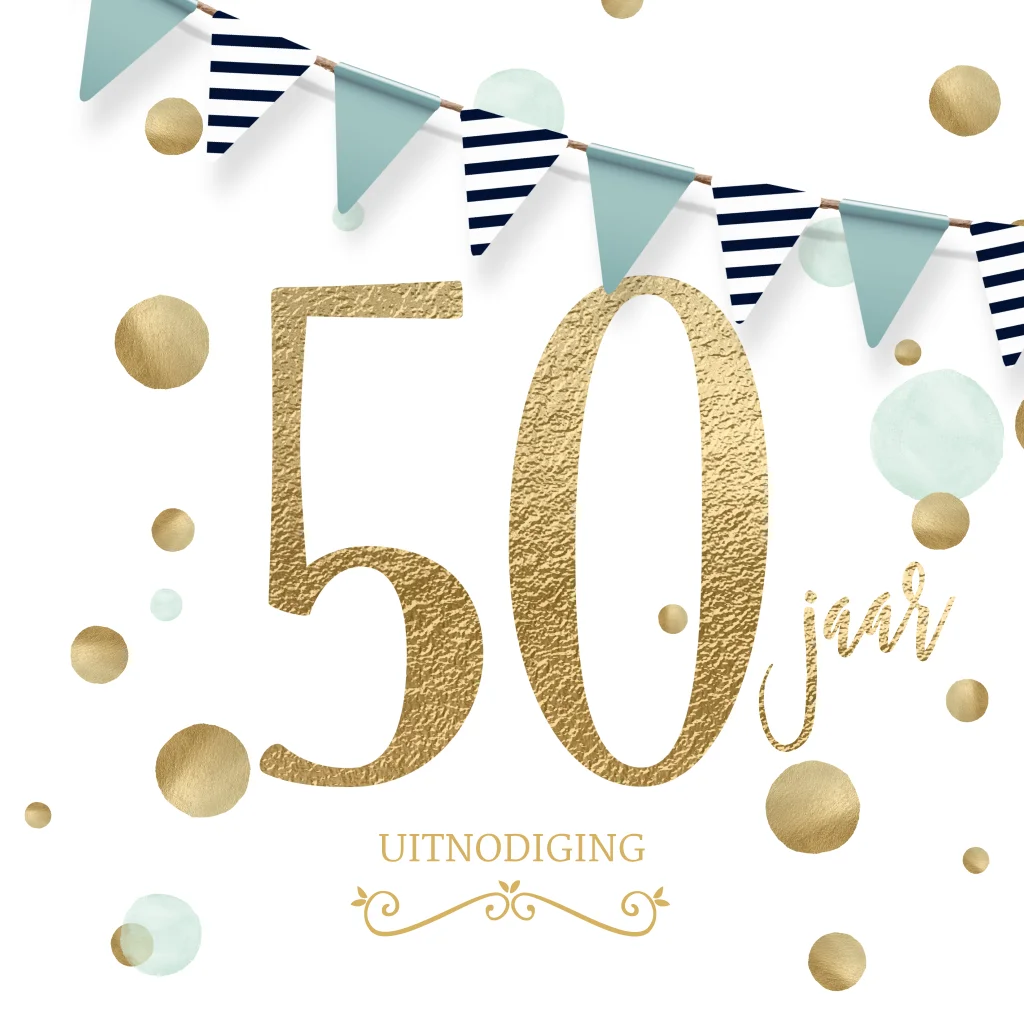 Een mooie uitnodiging voor een verjaardag van 50 jaar die je zelf kan maken met mooie goud look cijfers op een stijlvolle witte achtergrond en feestelijke vlaggetjes en stippen.