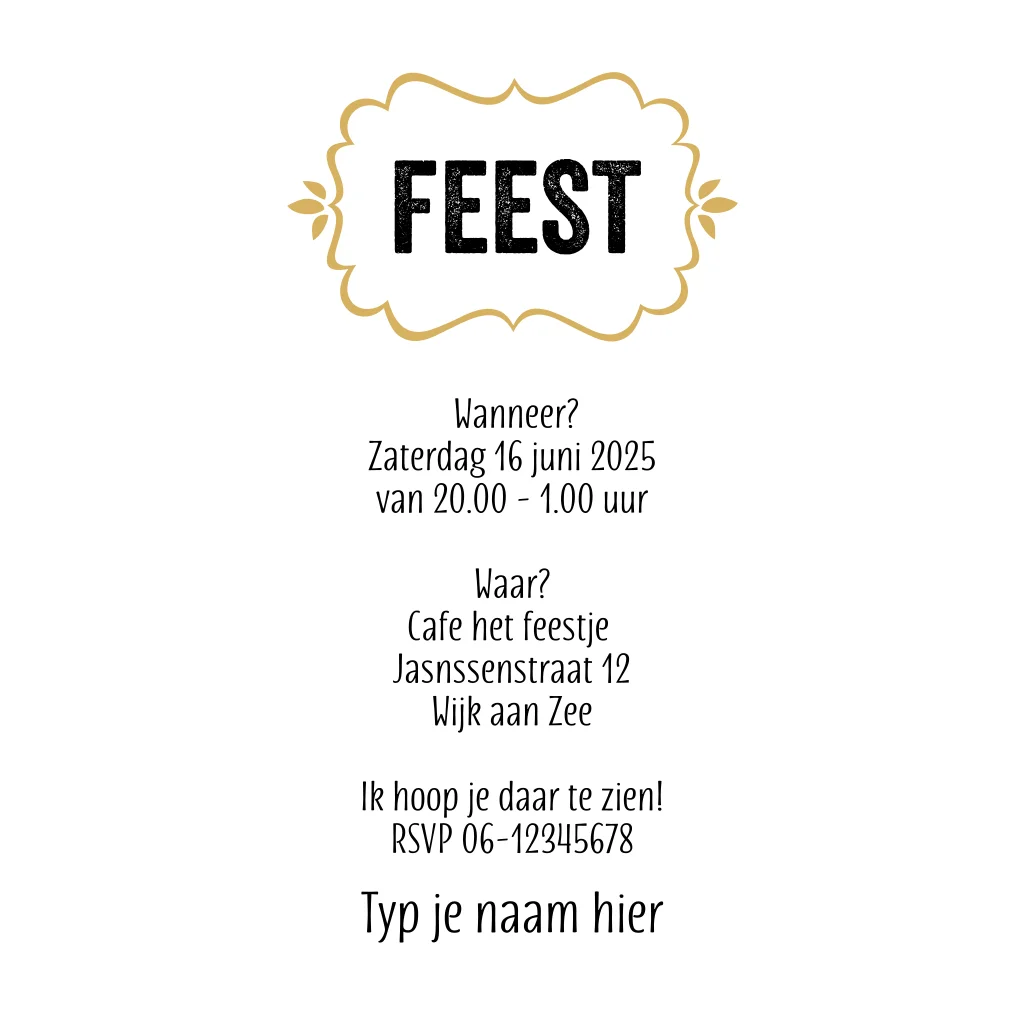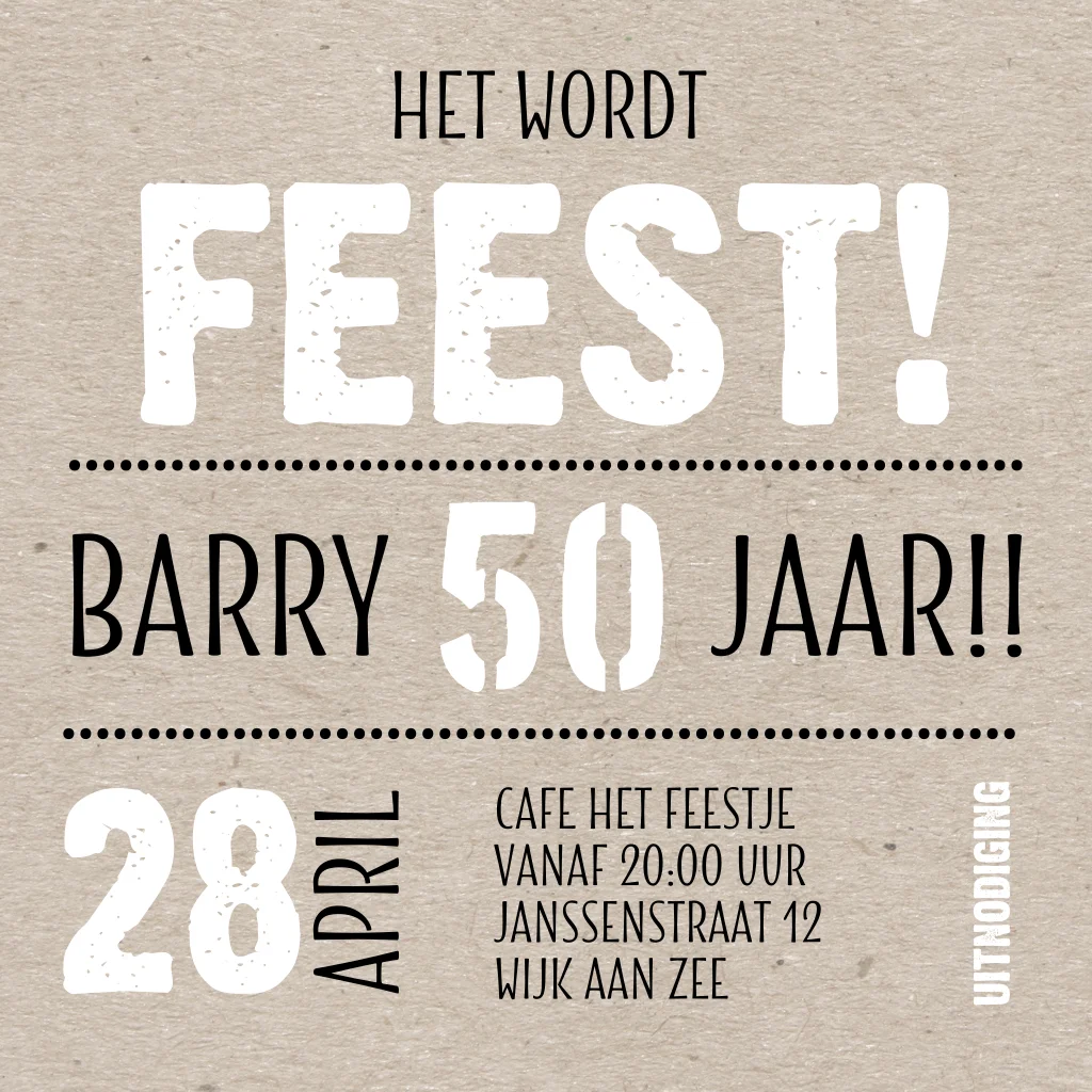 Hippe uitnodiging voor 50 jaar die je zelf kan personaliseren. Met witte en zwarte typografische letters op een karton look achtergrond.