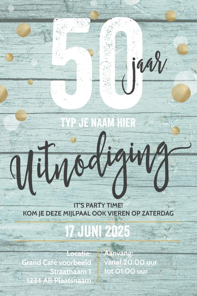 Dit voorbeeld heeft een mooie mint kleurige houten achtergrond en stijlvolle typografie. Ontwerp je eigen verjaardag uitnodigingen 50 jaar en stuur deze naar alle vrienden en familie.