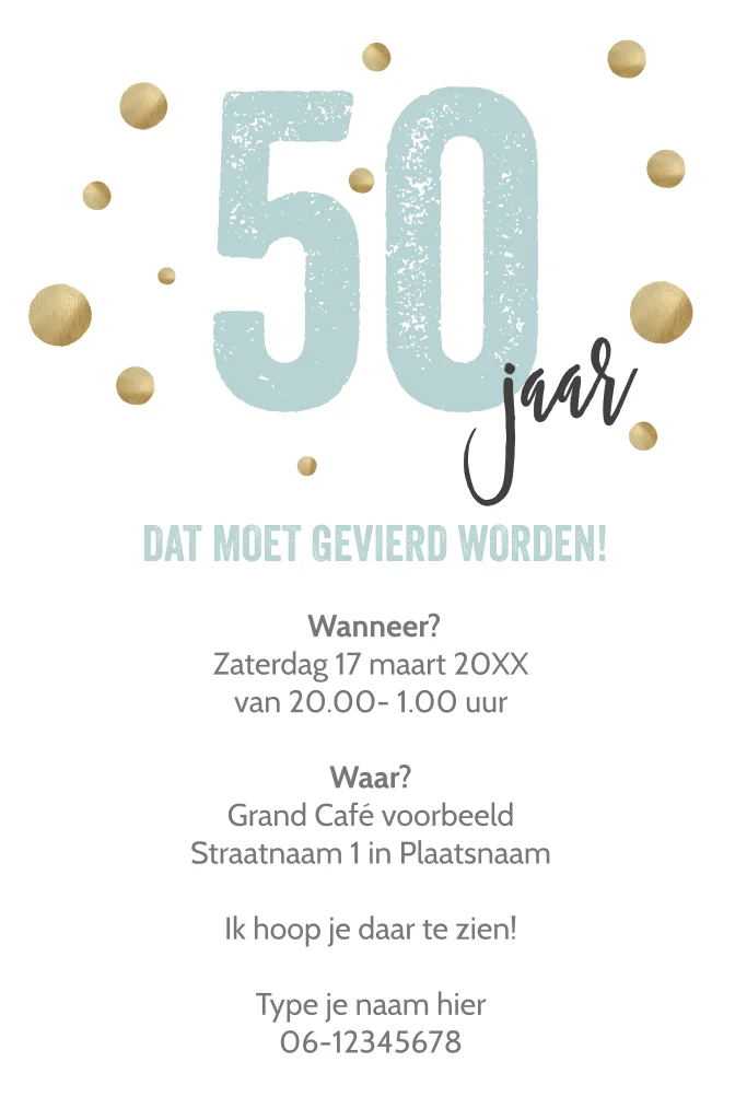 Maak eenvoudig deze hippe uitnodigingskaart voor je 50ste verjaardag zelf. Pas de teksten, kleuren en achtergronden aan.