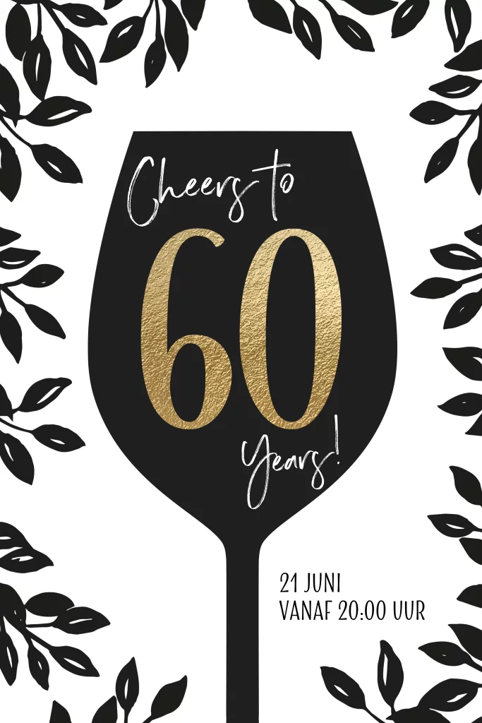 Chique verjaardag uitnodiging 60 jaar met leuke tekst "Cheers to 60 years!". Met een stijlvolle illustratie, botanische bladeren in de kleuren zwart, wit en goud.