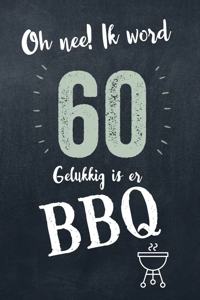 Grappige verjaardag uitnodiging met de tekst "Oh nee ik word 60 jaar, gelukkig is er BBQ". Verander het woord barbecue gemakkelijk in bier, een tuinfeest, muziek of een ander woord dat goed bij je past. Alle kleuren, leeftijd en uitnodigingsteksten kun je zelf gemakkelijk personaliseren.