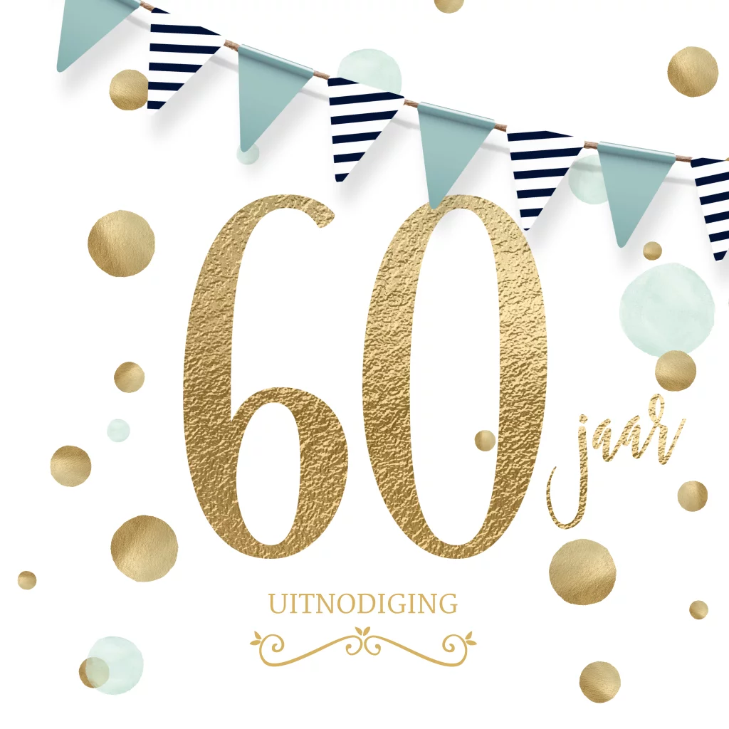 Deze mooie uitnodiging voor een verjaardag van 60 jaar kan je eenvoudig zelf maken en personaliseren bij Luckz. Met feestelijke goud look 60 jaar cijfers, bubbel confetti en kleurige vlaggetjes.