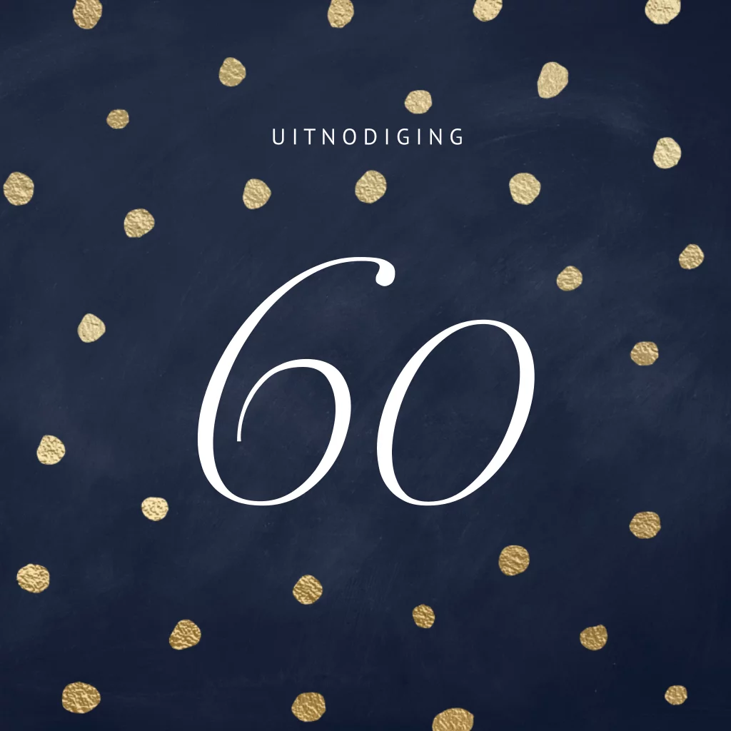 Een chique uitziende uitnodiging voor een zestigste verjaardag voor een man of vrouw. Met een donker blauwe achtergrond met daarop gouden confetti stippen en groot in witte typografie de leeftijd 60 jaar. De gouden stippen komen in de binnenkant van de uitnodigingskaart weer terug.