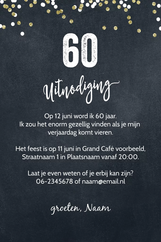 Zet zelf je leukste eigen foto op de voorkant van de uitnodiging. Rondom staat feestelijke goud met witte confetti stippen en groot in witte typografie staat "uitnodiging 60" jaar. In de binnenzijde kun je zelf een originele uitnodigingstekst schrijven.