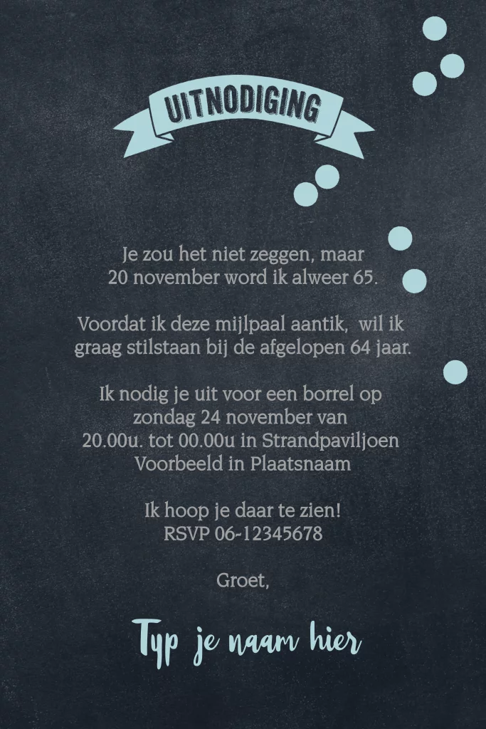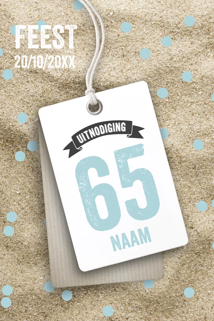 Een mooie en speciale strandfeest uitnodigingen voor je feest met label en de leeftijd 65 jaar (aanpasbaar), confetti, zand achtergrond en krijtbord zwart aan de binnenkant.