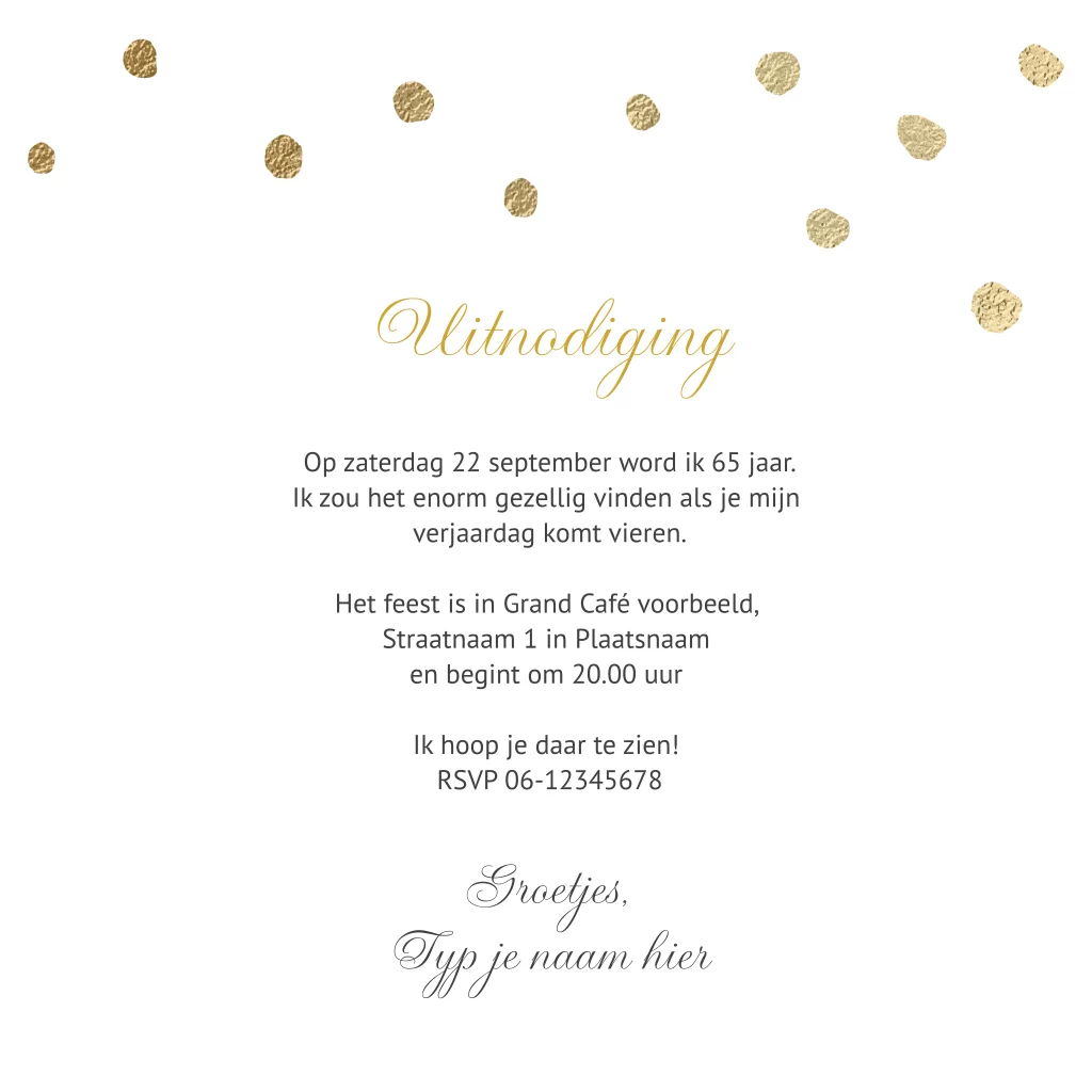 Luxe uitnodiging voor een verjaardag van 65 jaar die je zelf gemakkelijk kan aanpassen en personaliseren bij Luckz.