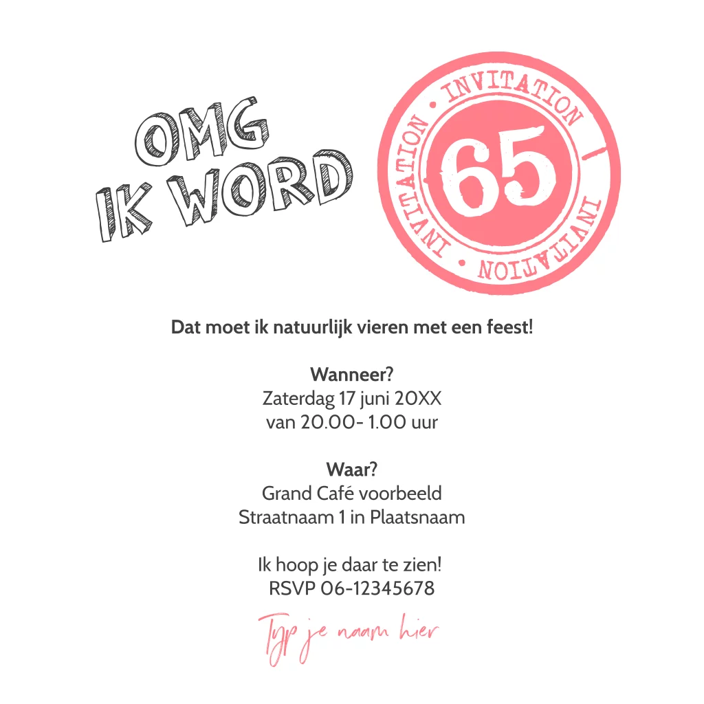 Grappige uitnodiging voor een verjaardag van 65 jaar. Want OMG dat moet gevierd worden met een groots feest! Origineel design van Luckz.