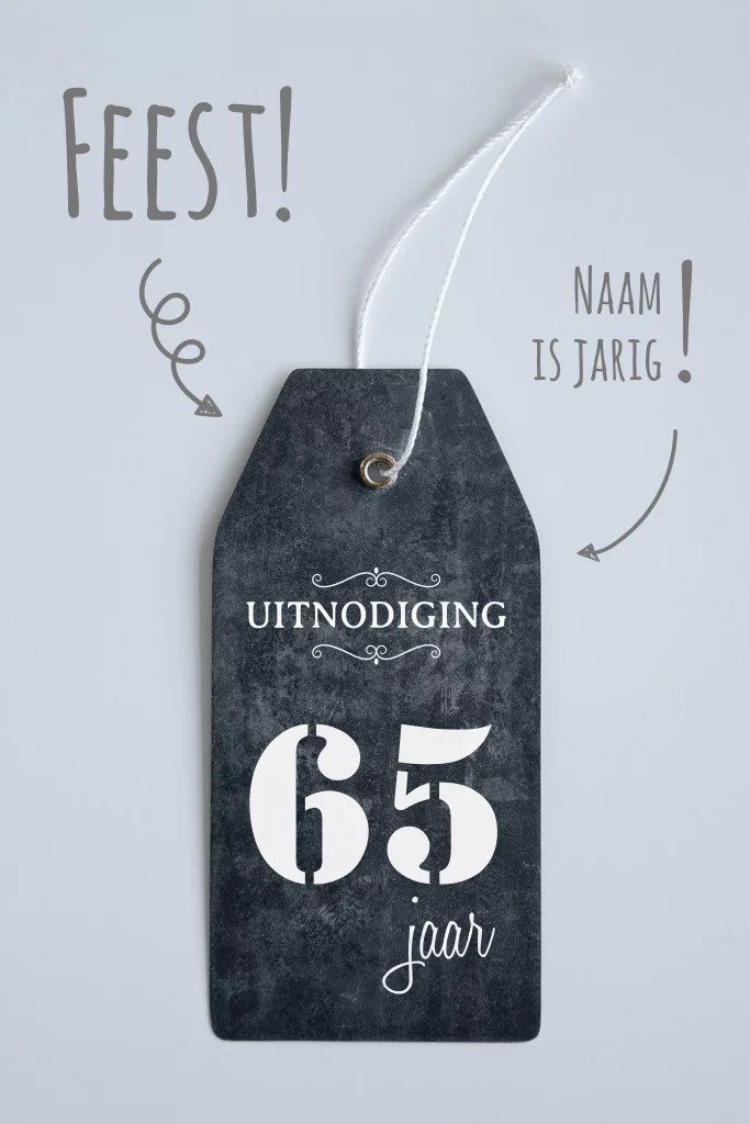 Maak zelf deze hippe verjaardag uitnodigingen voor 65 jaar. Met op de voorkant een leuk krijtbord look label met de tekst "Uitnodiging 60 jaar". En leuke typografische elementen en pijltjes.