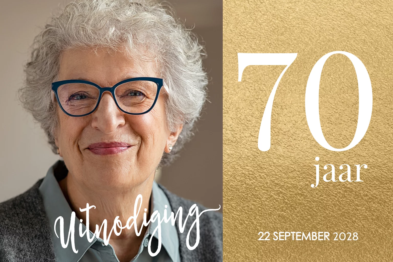 Mooie uitnodiging met je eigen foto op de voorkant en gouden achtergrond effecten met daarop in leuke typografie de tekst 70 jaar (leeftijd is te wijzigen) en de datum van het feest.