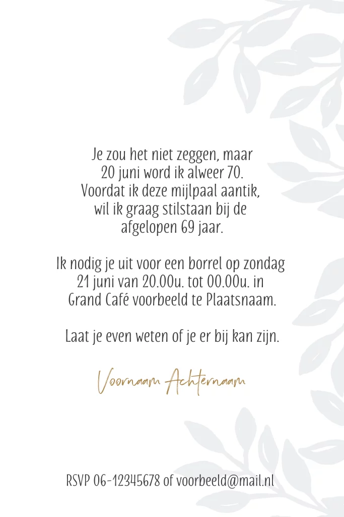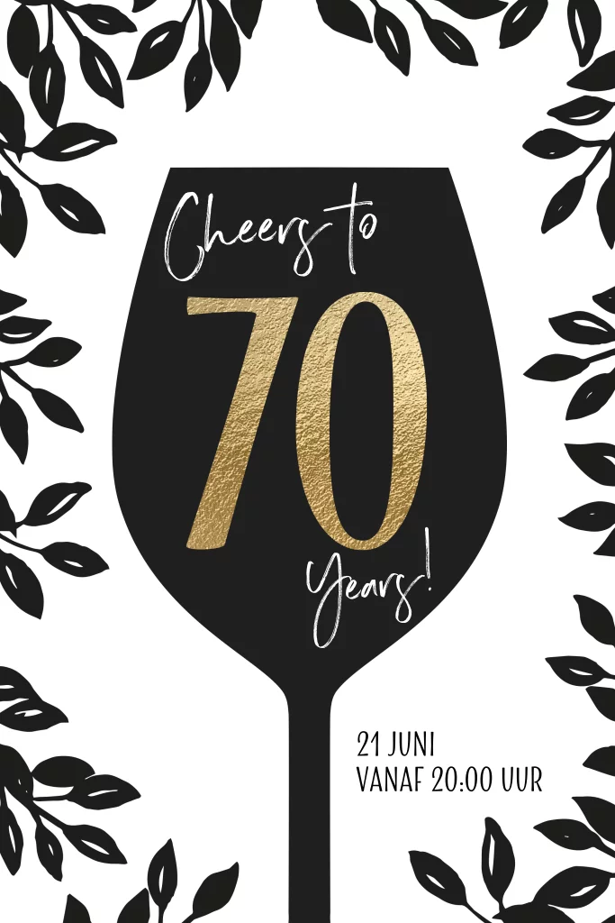 Chique verjaardag uitnodiging 70 jaar met een stijlvolle illustratie van een glas, botanische bladeren en de kleuren zwart, wit en goud. Op de voorkant een leuke tekst "Cheers to 70 years!".