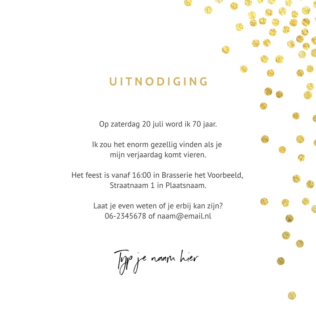 Elegante verjaardag uitnodiging voor 70 jaar met groot het getal zeventig in goud kleur op een zwarte achtergrond met rondom de uitnodigingskaart kleine confetti design elementjes.