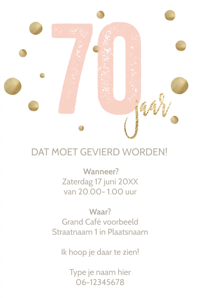 Luxe verjaardag uitnodiging voor 70 jaar die je helemaal kan personaliseren. Met mooie stijlvolle gouden en roze letter typografie op een witte achtergrond.