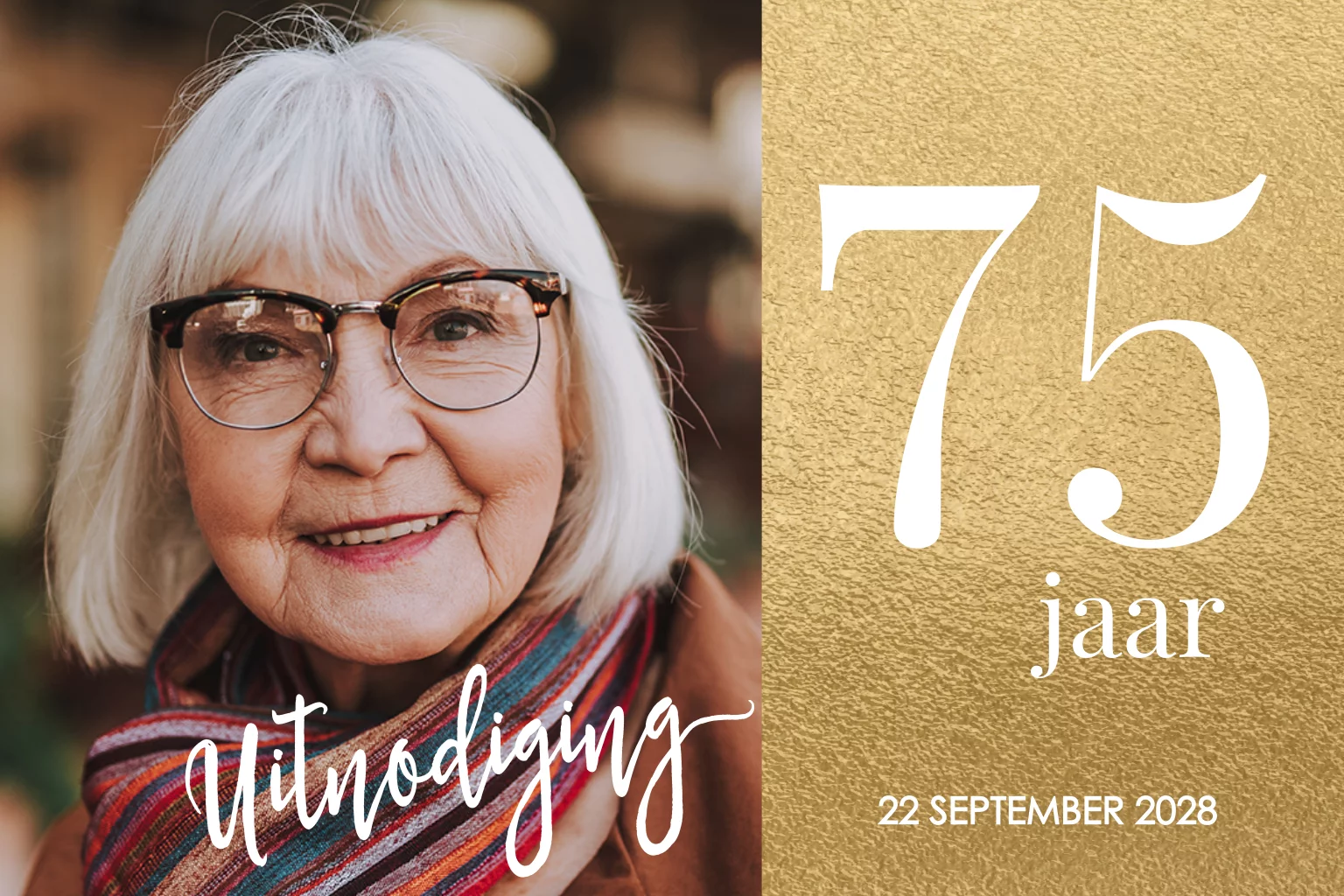Uitnodigingen met eigen foto en goud effect achtergrond met daarop in een leuk wit lettertype staat 75 jaar.