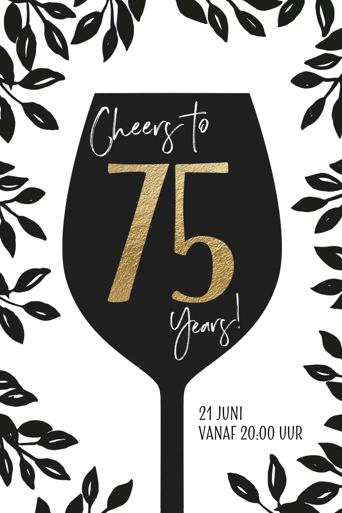 Chique zwart, wit met goud, verjaardag uitnodiging 75 jaar met een stijlvolle illustratie van een glas, botanische bladeren. Op de voorkant een leuke tekst "Cheers to 75 years!".