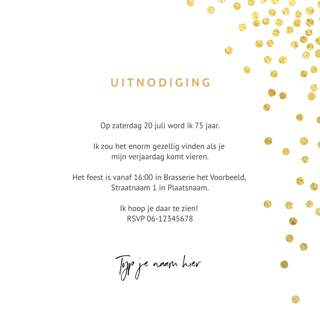 Elegant design verjaardag uitnodiging voor 75 jaar met feestelijke gouden confetti en groot het getal 75 op een zwarte achtergrond.