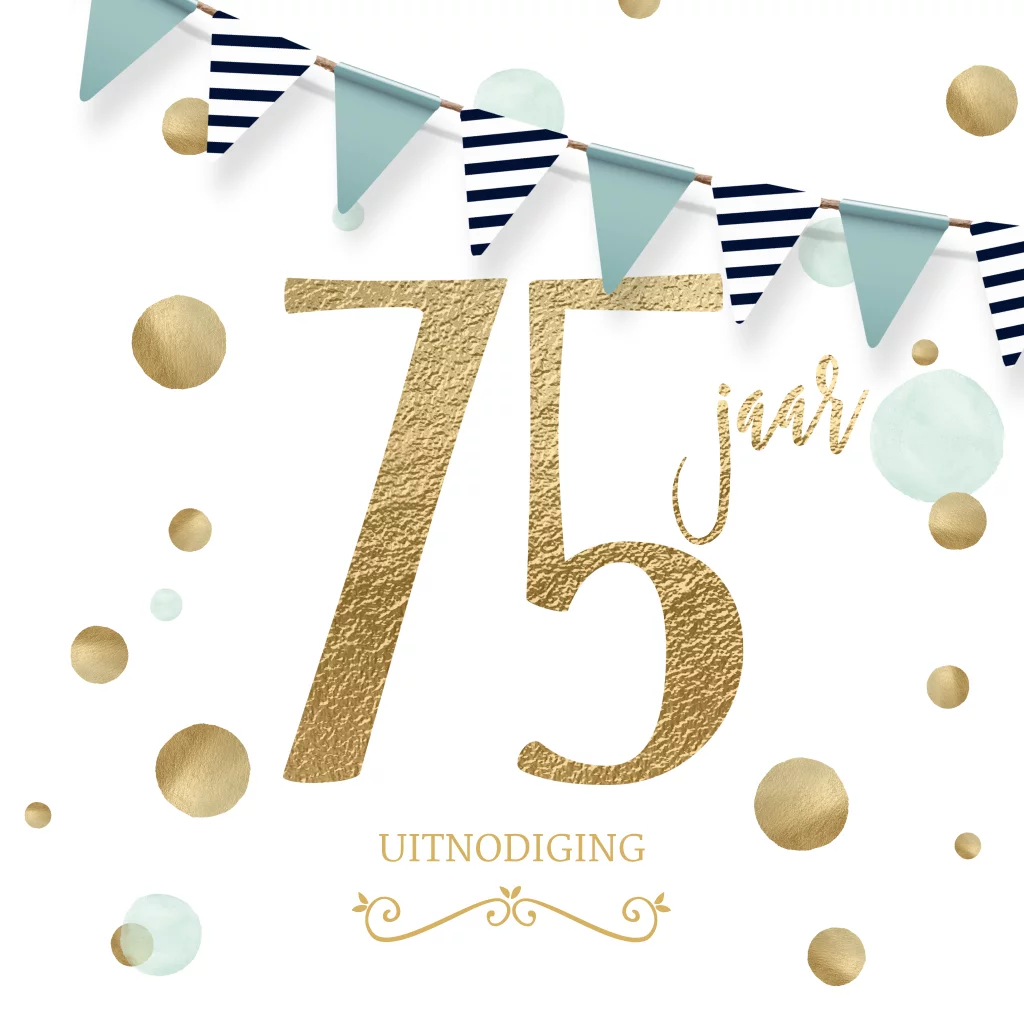 Een leuke uitnodiging voor een verjaardag van 75 jaar met feestelijke versieringen van vlaggetjes en confetti bubbels van Luckz.