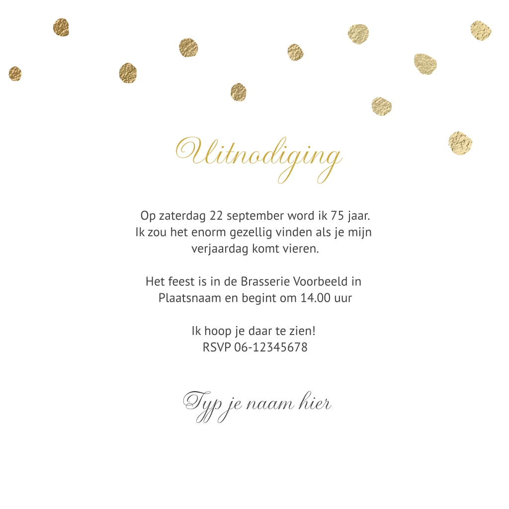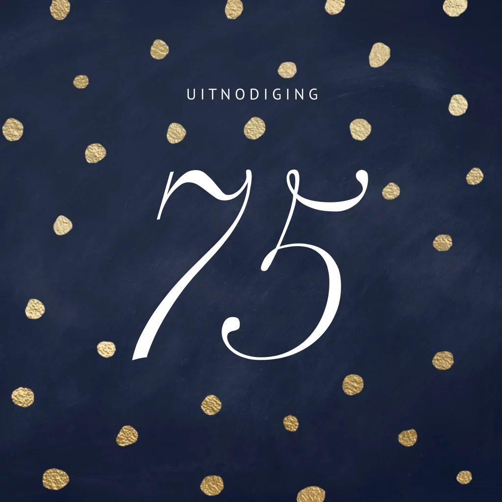 Chique uitziende uitnodigingen voor een vijfenzeventigste verjaardag met stijlvolle gouden stippen op een donker blauwe achtergrond en groot de leeftijd 75 jaar (aanpasbaar) in witte typografie op de voorkant. In de binnenkant komen de gouden stippen terug en kun je alle uitnodigingsteksten schrijven.