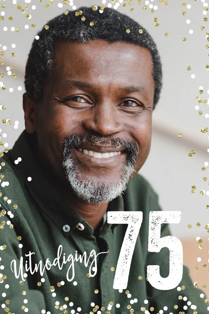 Pas de teksten, kleuren, achtergrond, foto en eventueel de leeftijden aan, zo ontwerp je zelf een originele uitnodiging voor een verjaardag van 75 jaar.